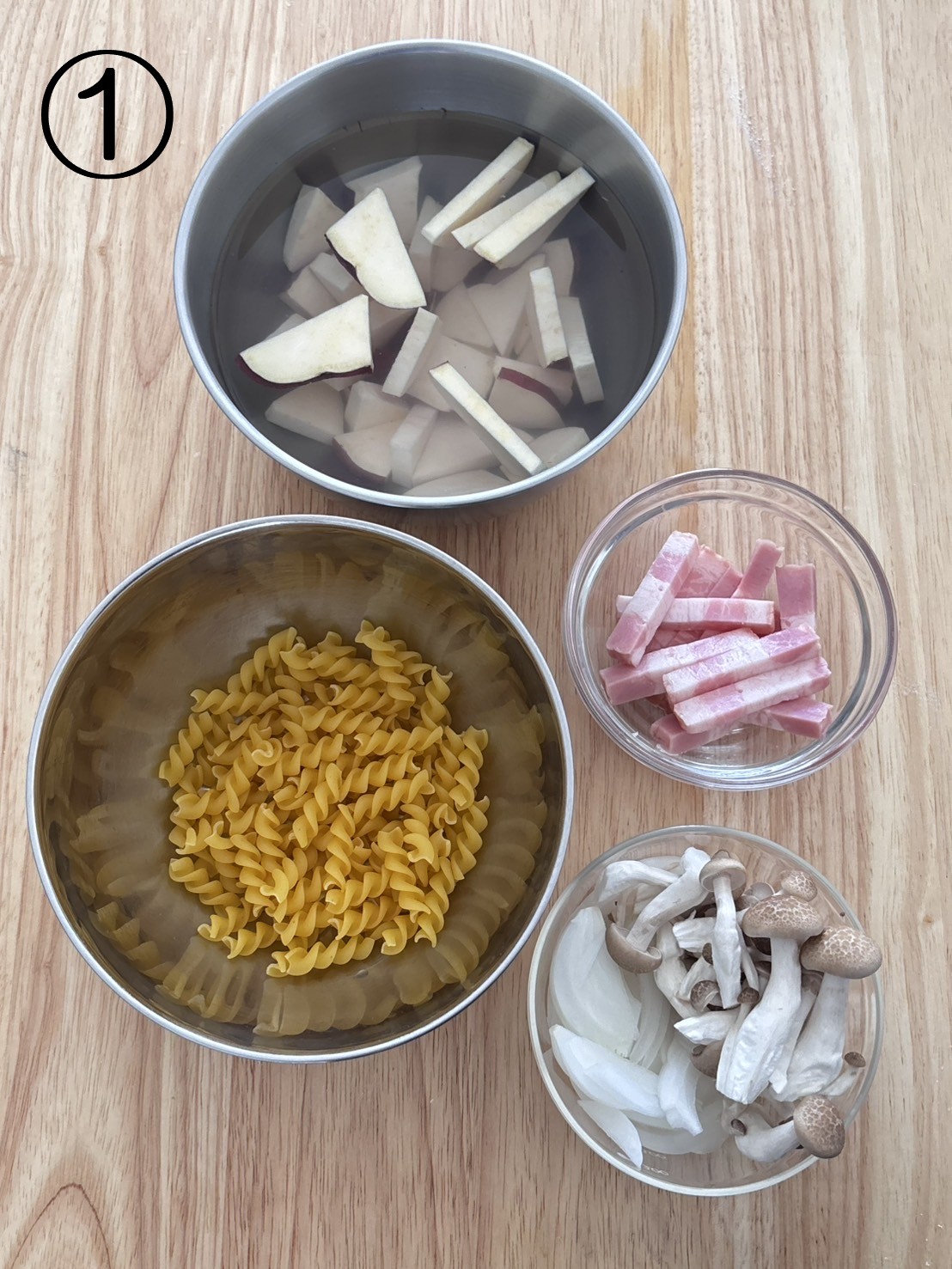 材料は写真の通りにカットする。さつま芋は火が通りやすいよう7~8mm厚さのいちょう切りにし、水さらししてあく抜きしておく。