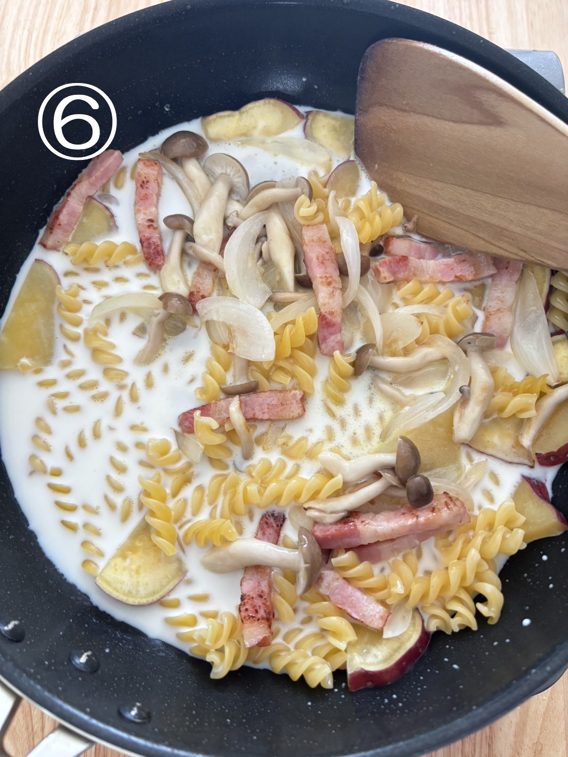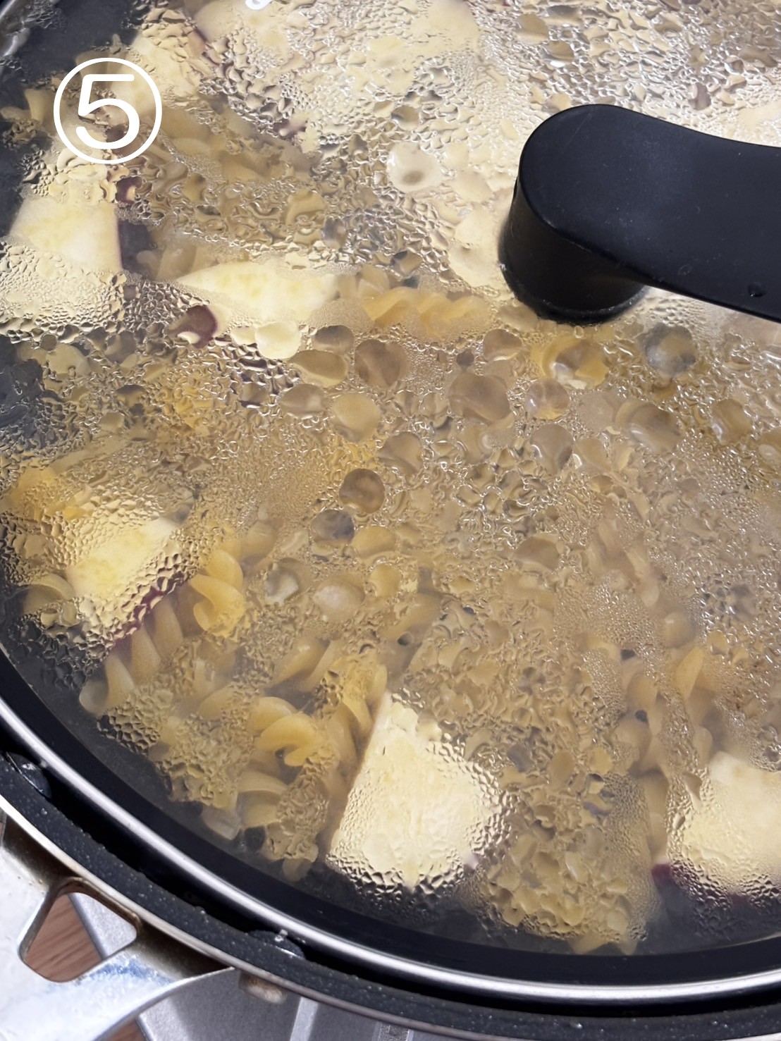 ⑤ パスタと水を加えて軽くヘラで混ぜ、蓋をしてさつま芋に火が通るまで5分程度弱めの中火で煮る。